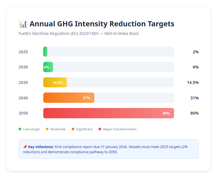 The regulation requires progressive reductions in GHG intensity from 2% below the 2020 baseline in 2025, stepping up incrementally to 80% by 2050. First compliance reports are due 31 January 2026, meaning exposure assessment and compliance planning cannot be deferred.