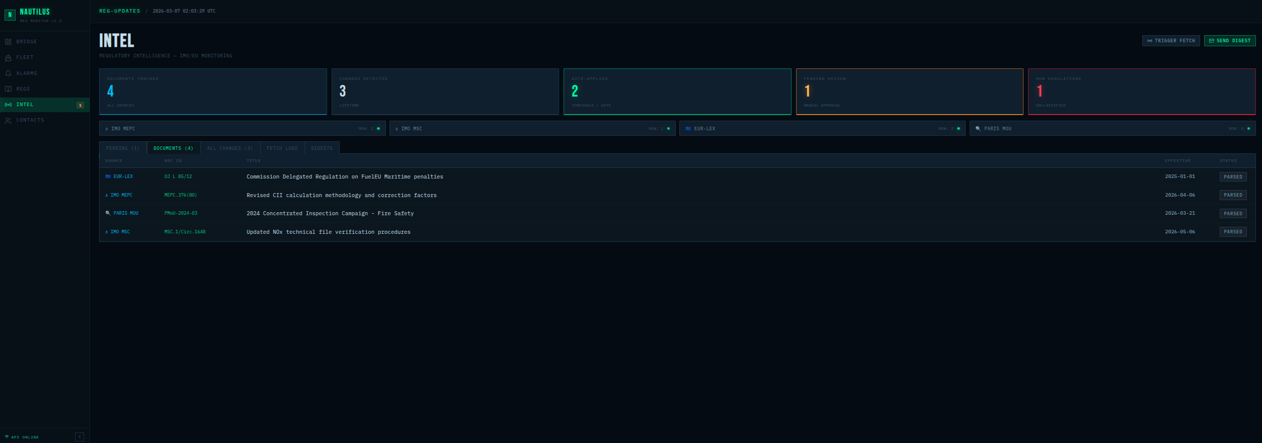 The system continuously tracks regulatory sources that affect maritime operations:- IMO MEPC/MSC — Environmental and safety circulars, resolution amendments
